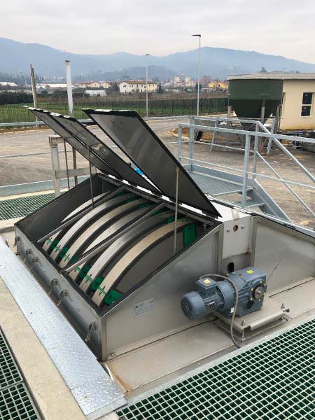 I solidi trattenuti dalle tele vengono spinti dal flusso di acqua di controlavaggio all’interno di un’apposita canalina posta all’interno del tubo centrale per poi scorrere verso la flangia di scarico dei solidi.